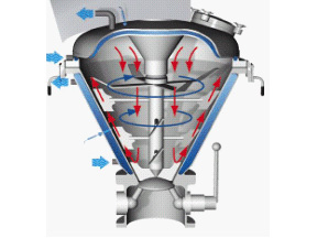 VC混合機(jī)由擺線減速機(jī)連接中心螺桿及外層螺帶以相同轉(zhuǎn)速運(yùn)轉(zhuǎn)。工作時(shí)中心螺桿將混合物料由底部提升到頂部,同時(shí)線速度較大的外部螺帶將物料由下向上沿錐形桶壁盤提升,兩種運(yùn)動(dòng)在離心力作用下又將物料沿切線方向拋向空間,物料產(chǎn)生強(qiáng)烈的對(duì)流剪切、擴(kuò)散,從而達(dá)到快速混合的目的(中心螺桿也可做成反向螺桿)。